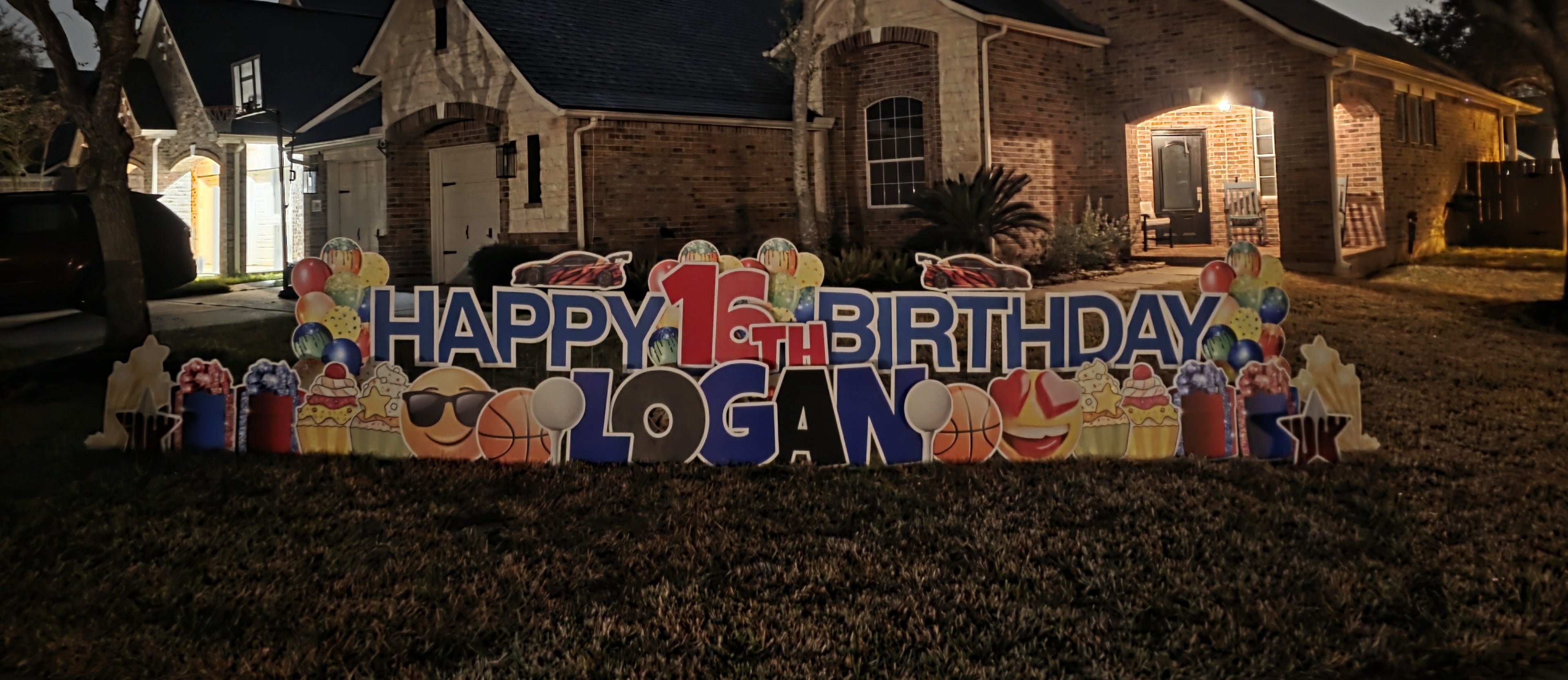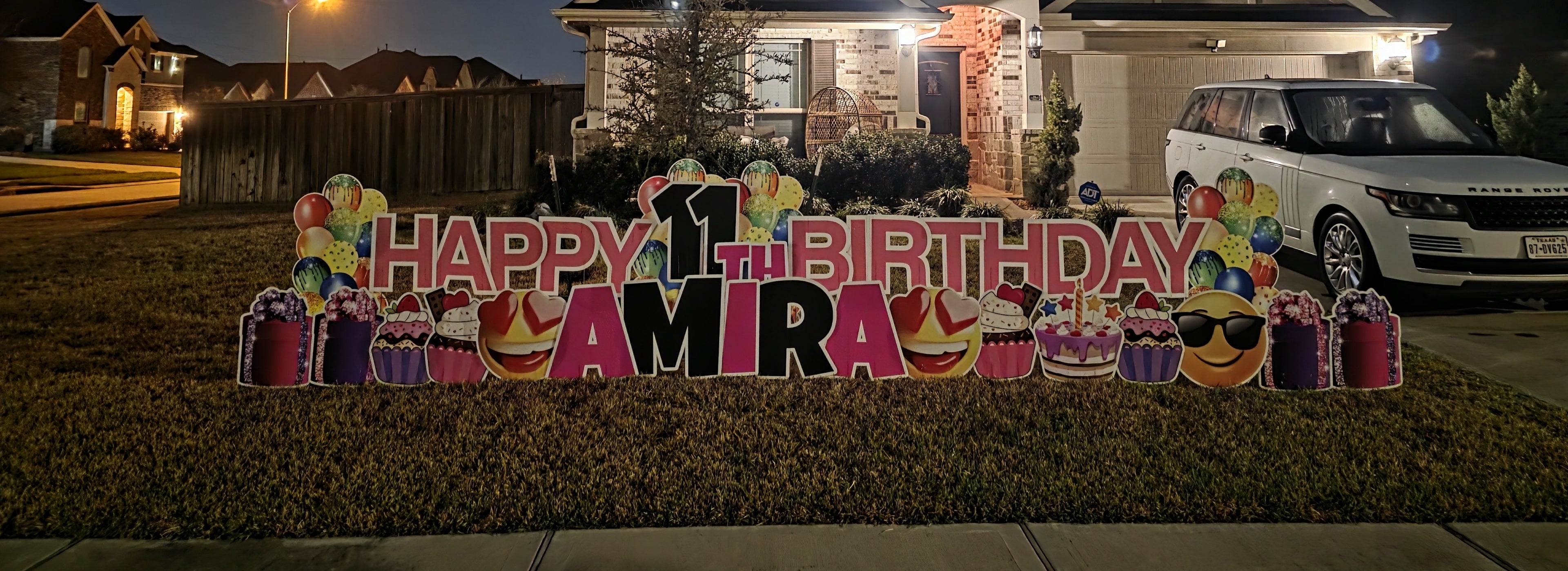 Each Setup comes with the Greeting you choose, a name and age are optional but can be included. Balloons, Gifts, Cakes/Cupcakes, Emoji's and extra flair such as stars will also be included. If you have specific needs please call or email me to inquire if they can be accommodated. Somethings may need to be ordered and that can be done for an additional cost. We also have an "Add-On" section just before Checkout with additions you can add to your Yard card as well.